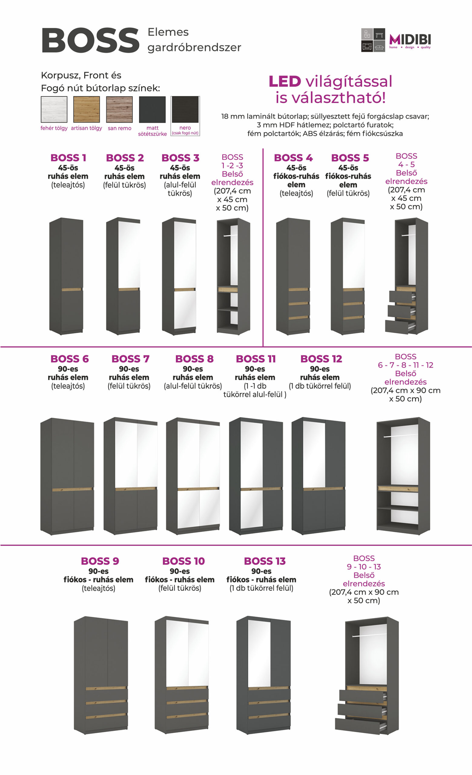 – BOSS1; BOSS2; BOSS3; BOSS4; BOSS5 – szél/mag/mély: 45 / 207,4 / 50 cm