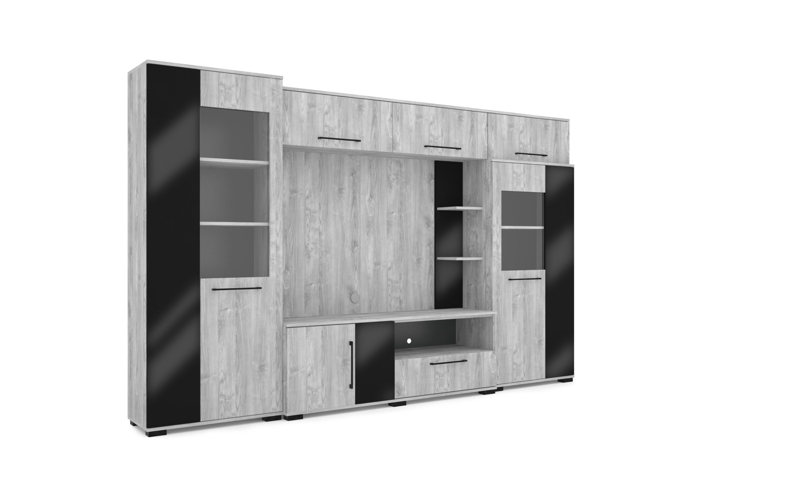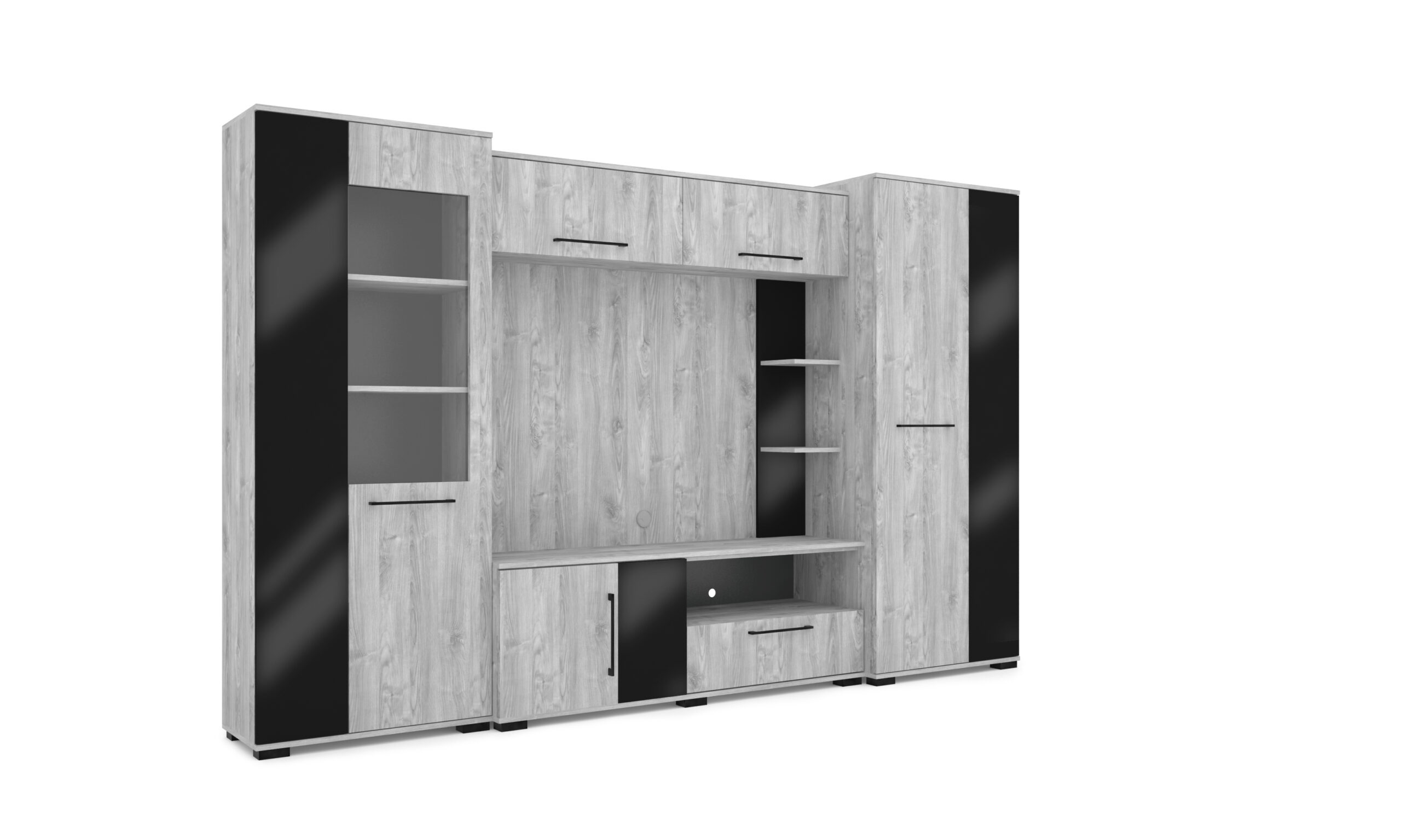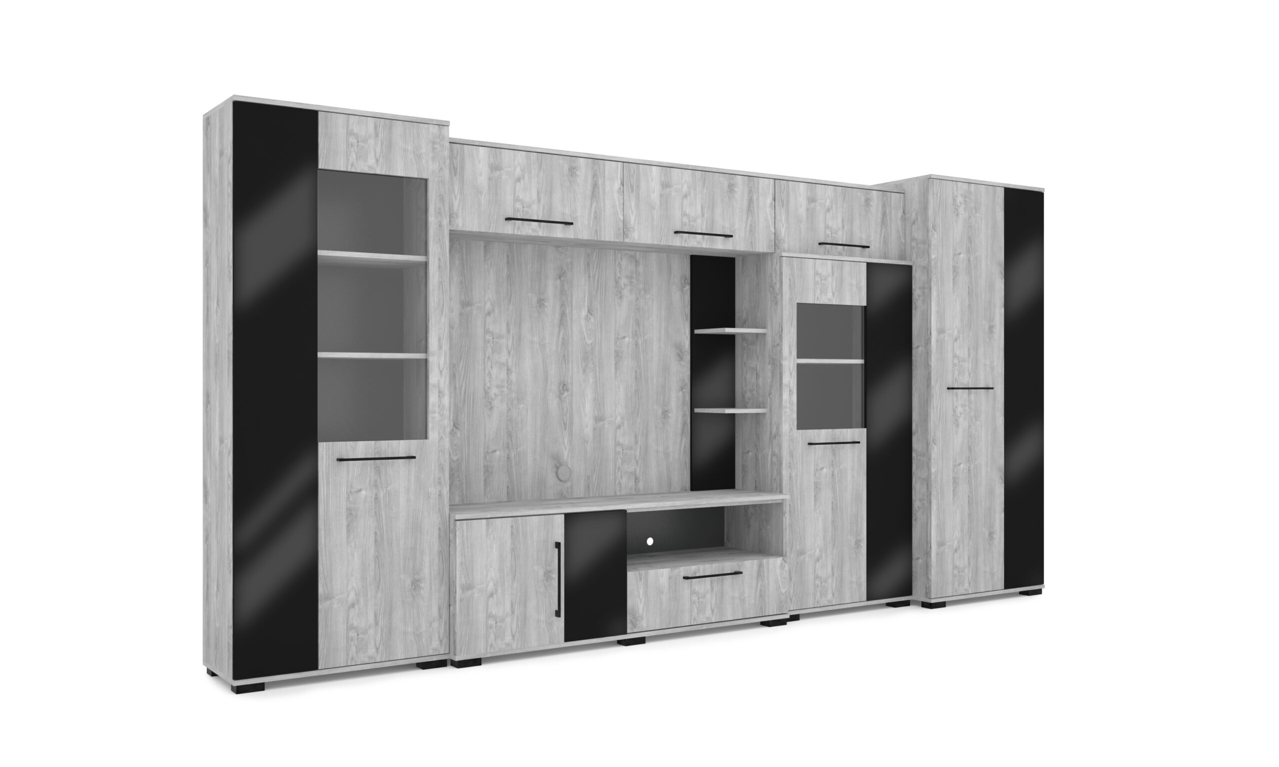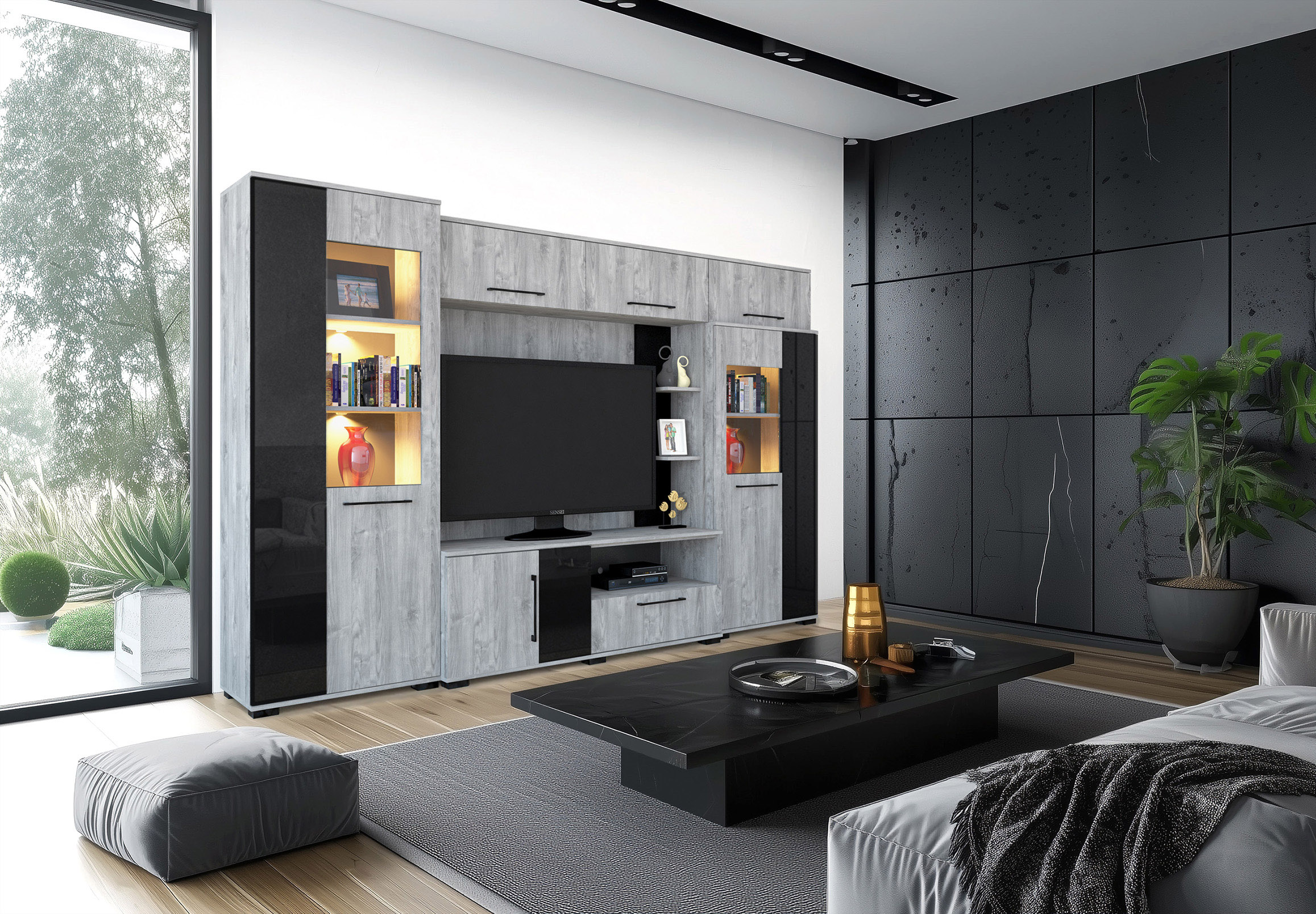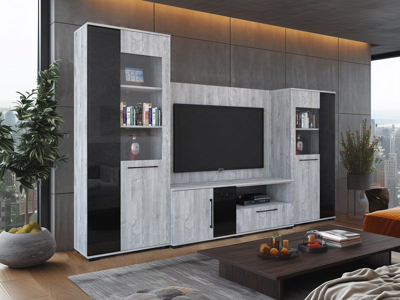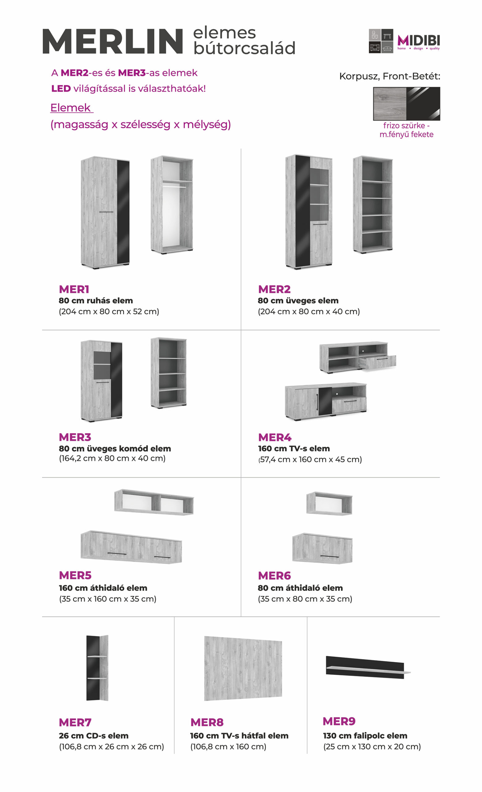 – Merlin elemes szekrénysorunk letisztult, modern megjelenésű, elegáns magasfényű fekete MDF betéttel.