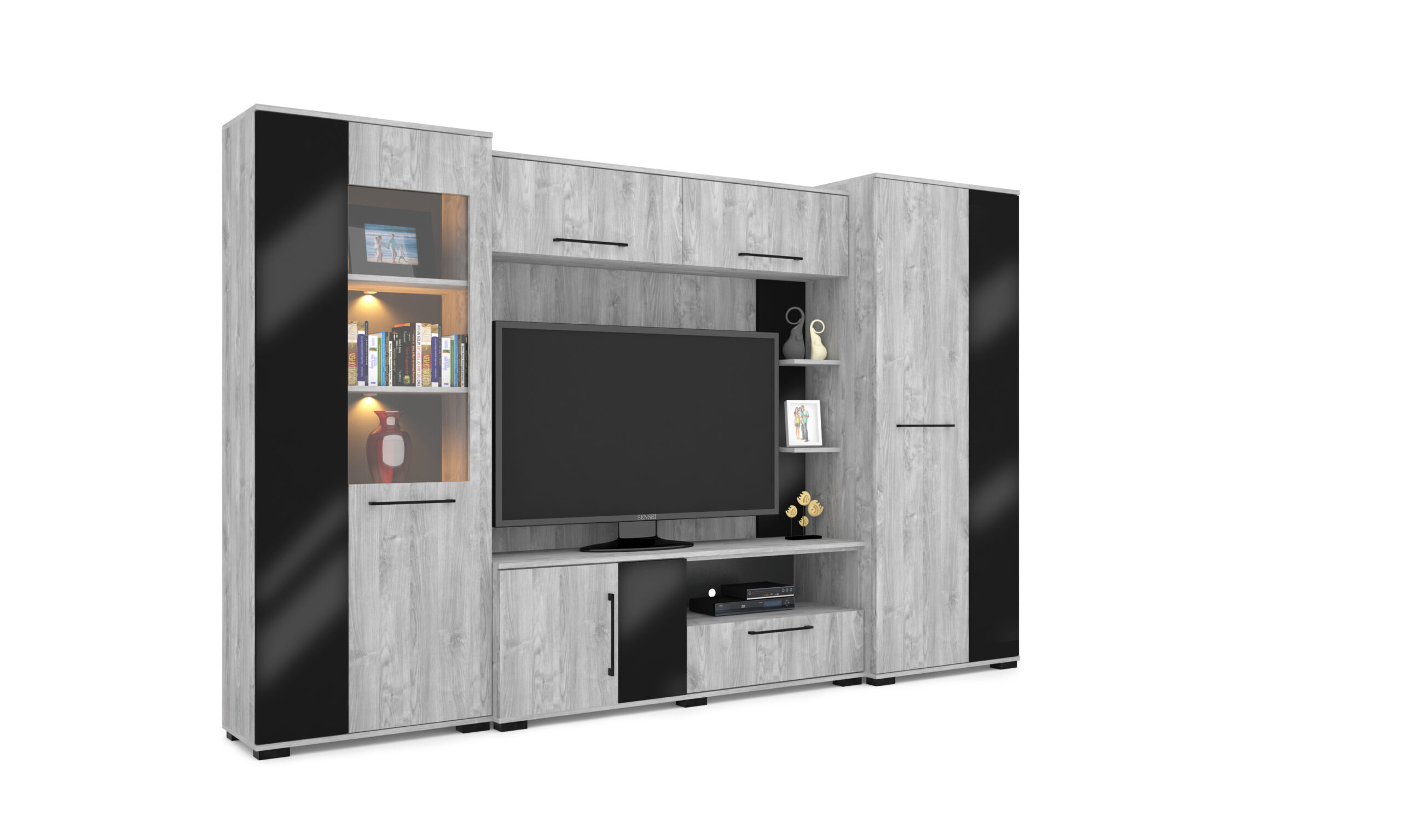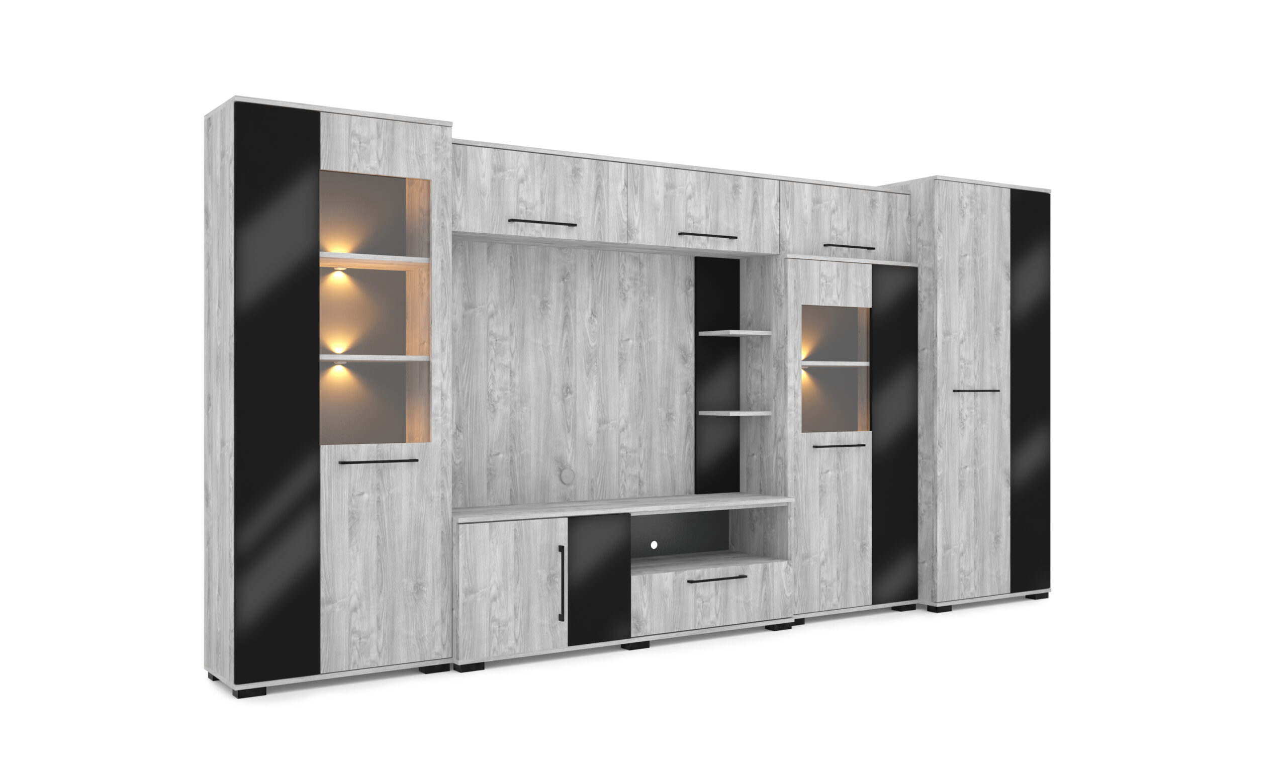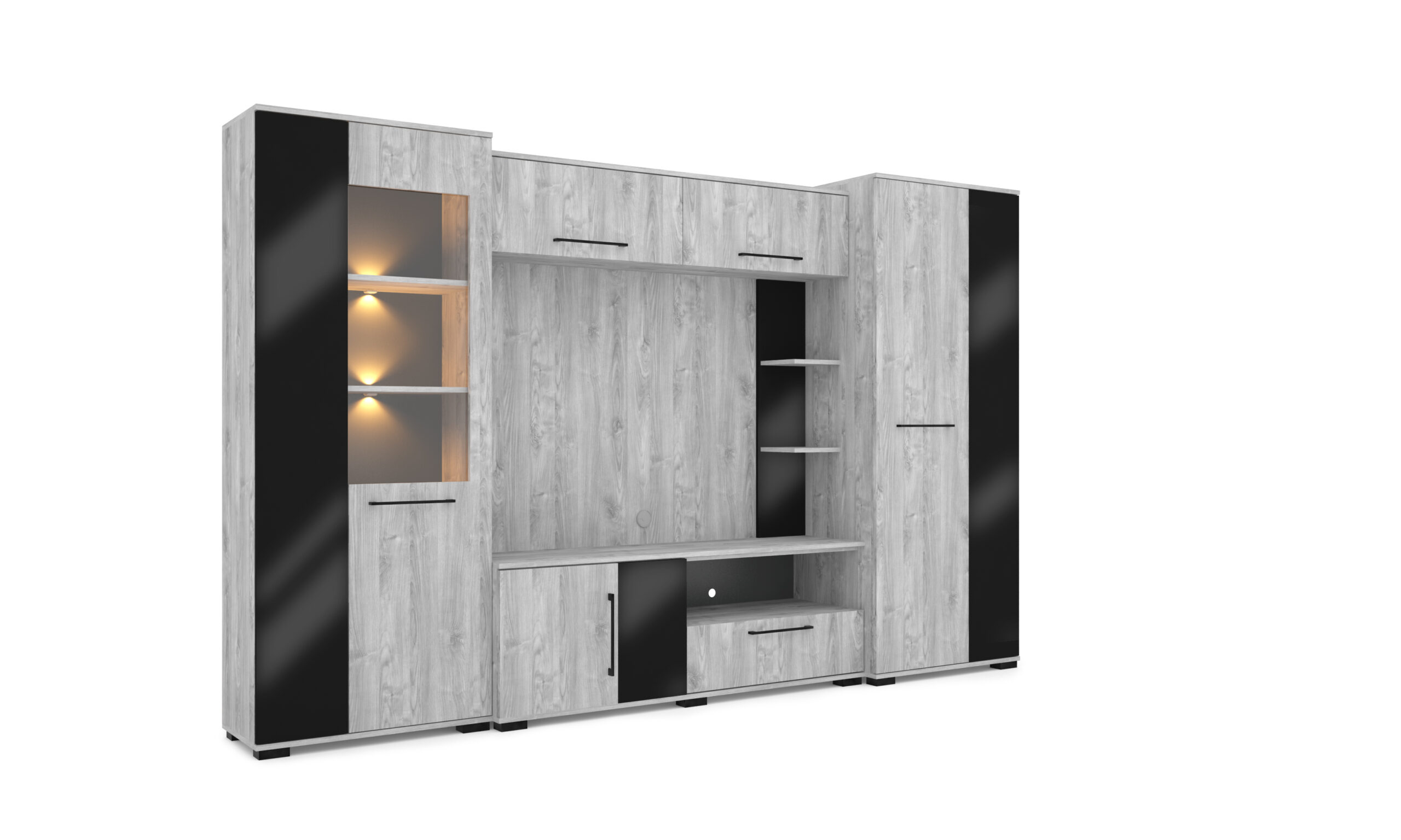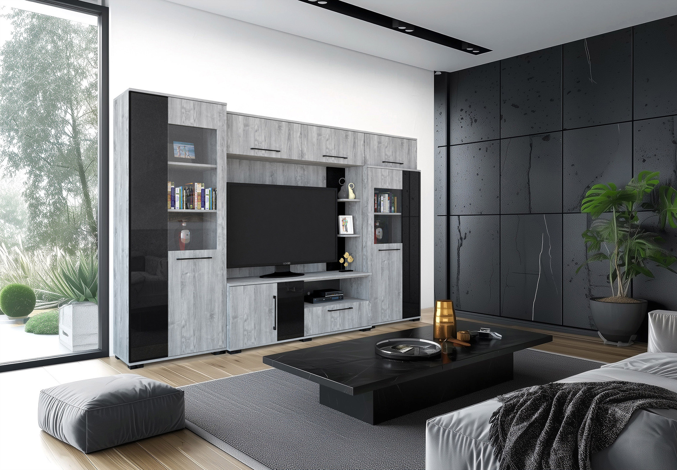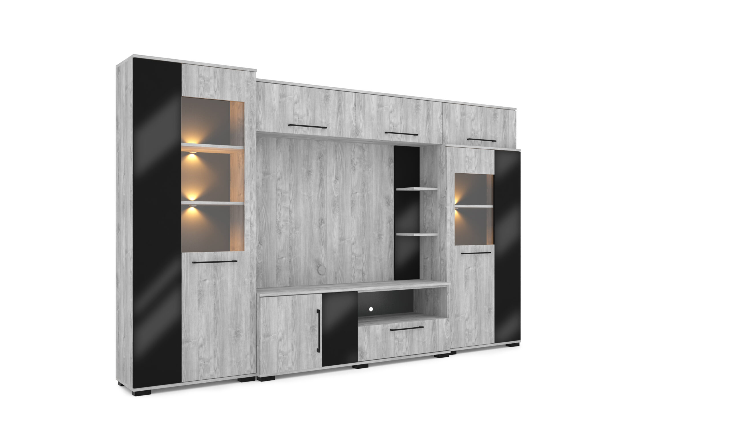 – Merlin elemes szekrénysorunk letisztult, modern megjelenésű, elegáns magasfényű fekete MDF betéttel.