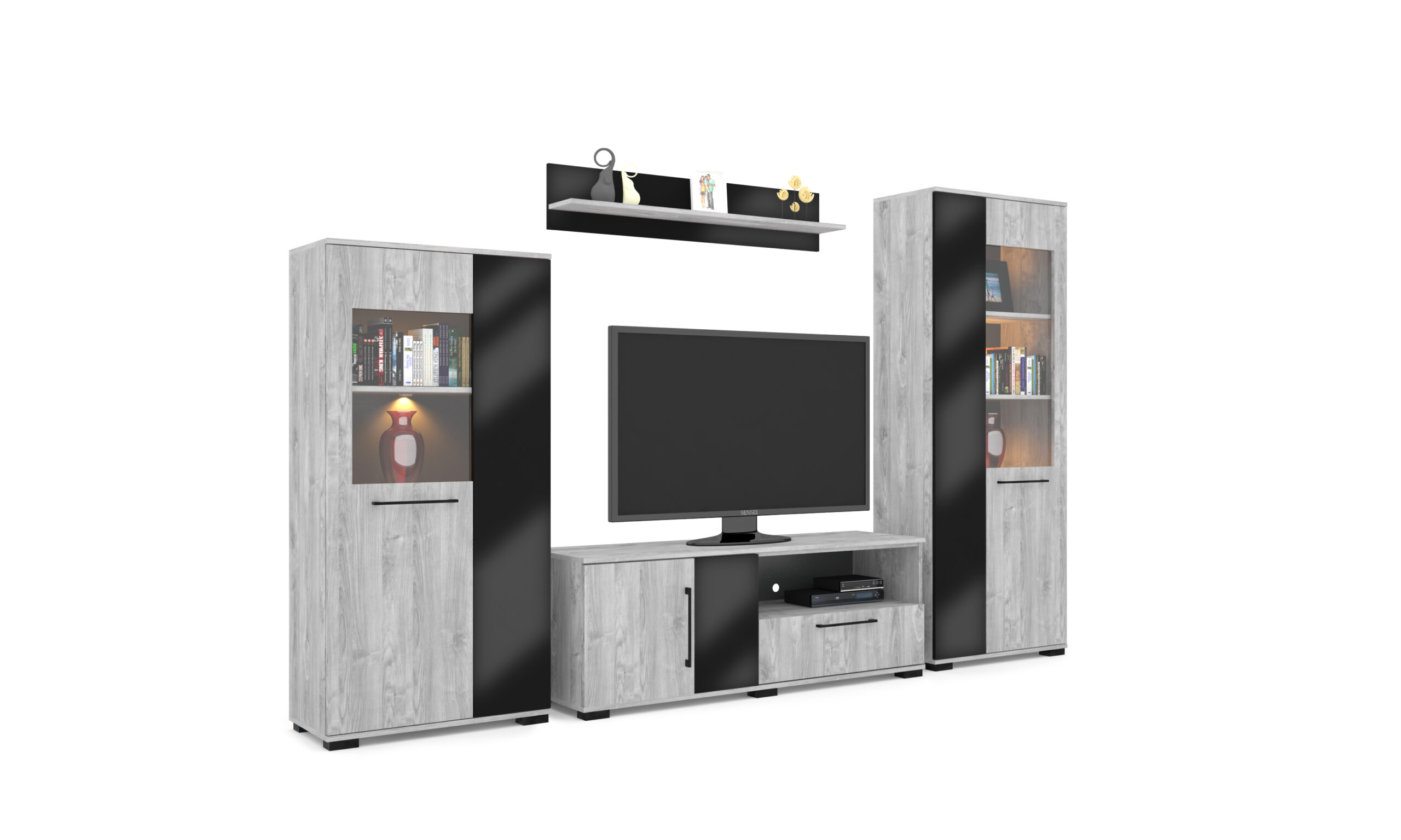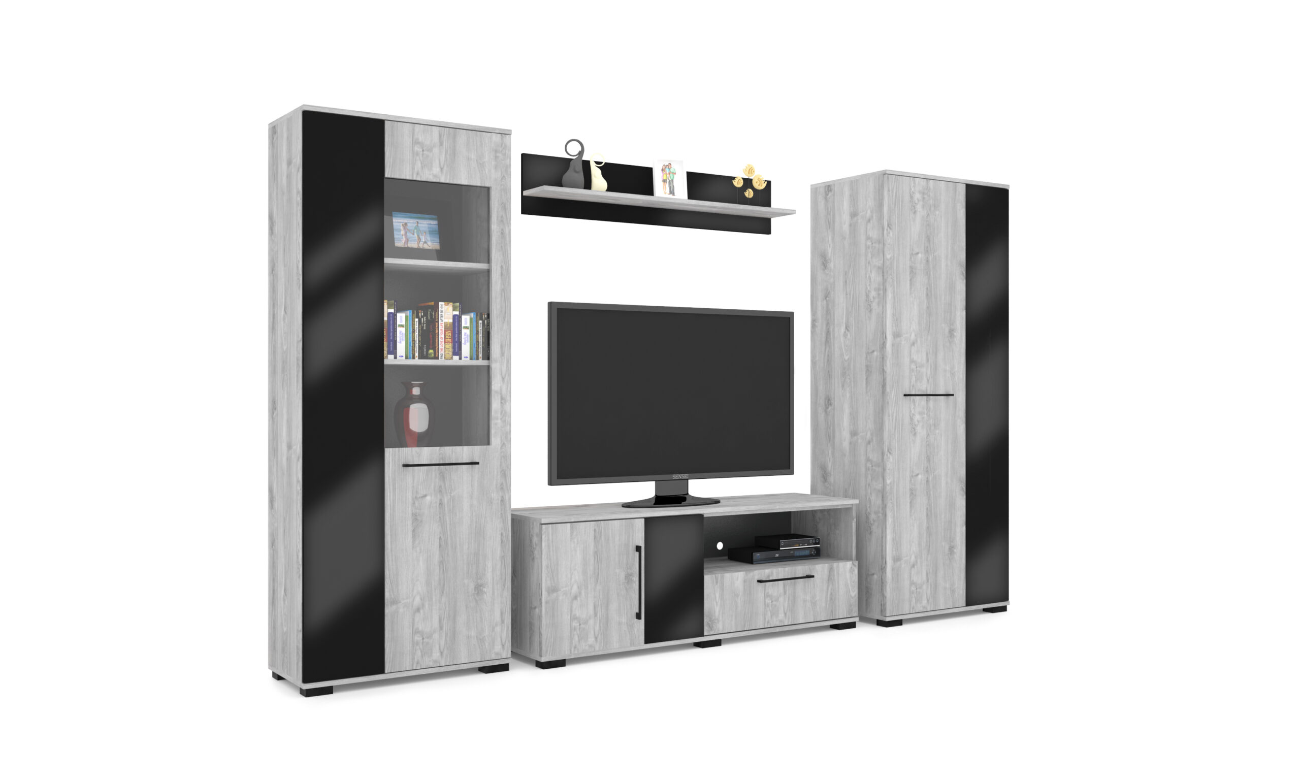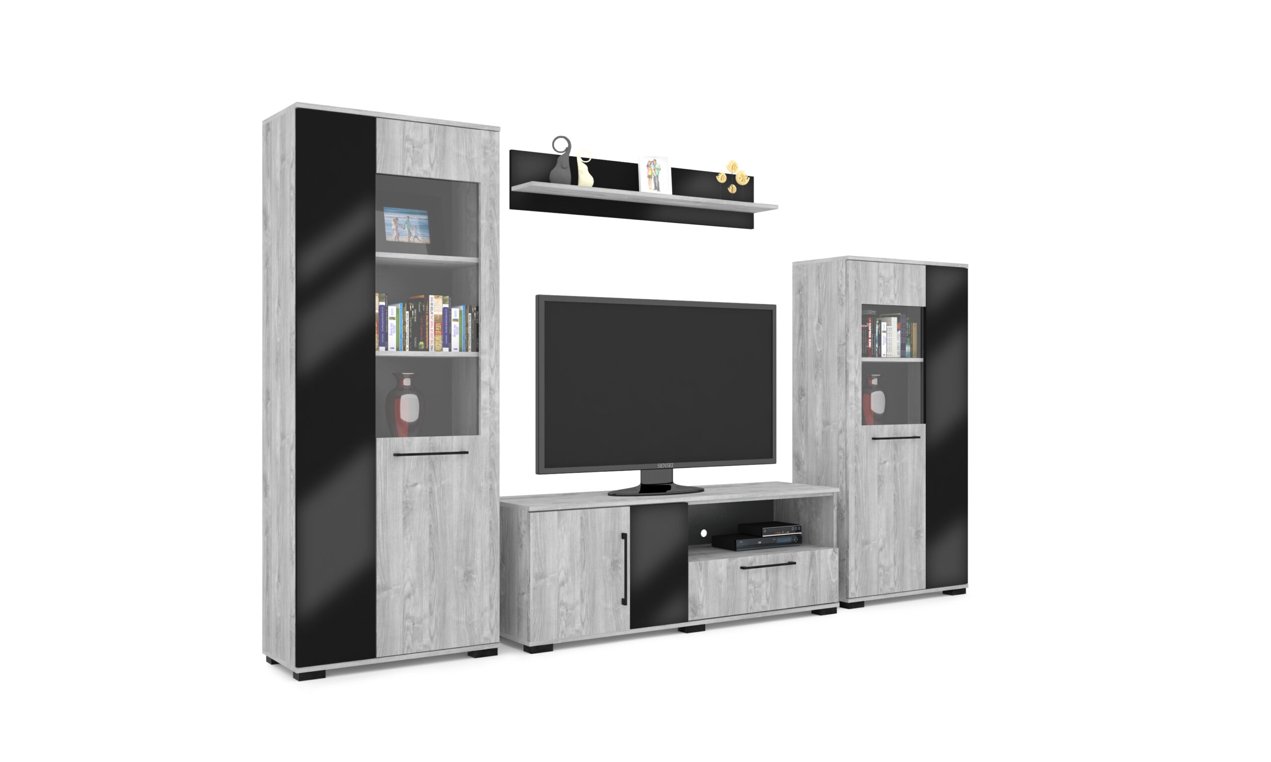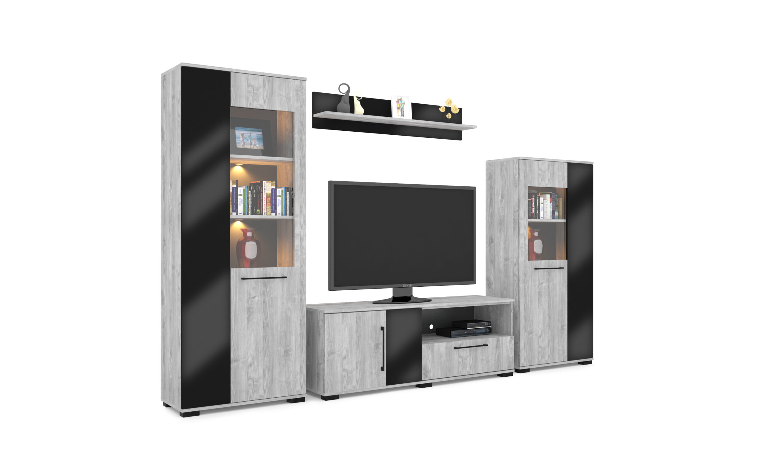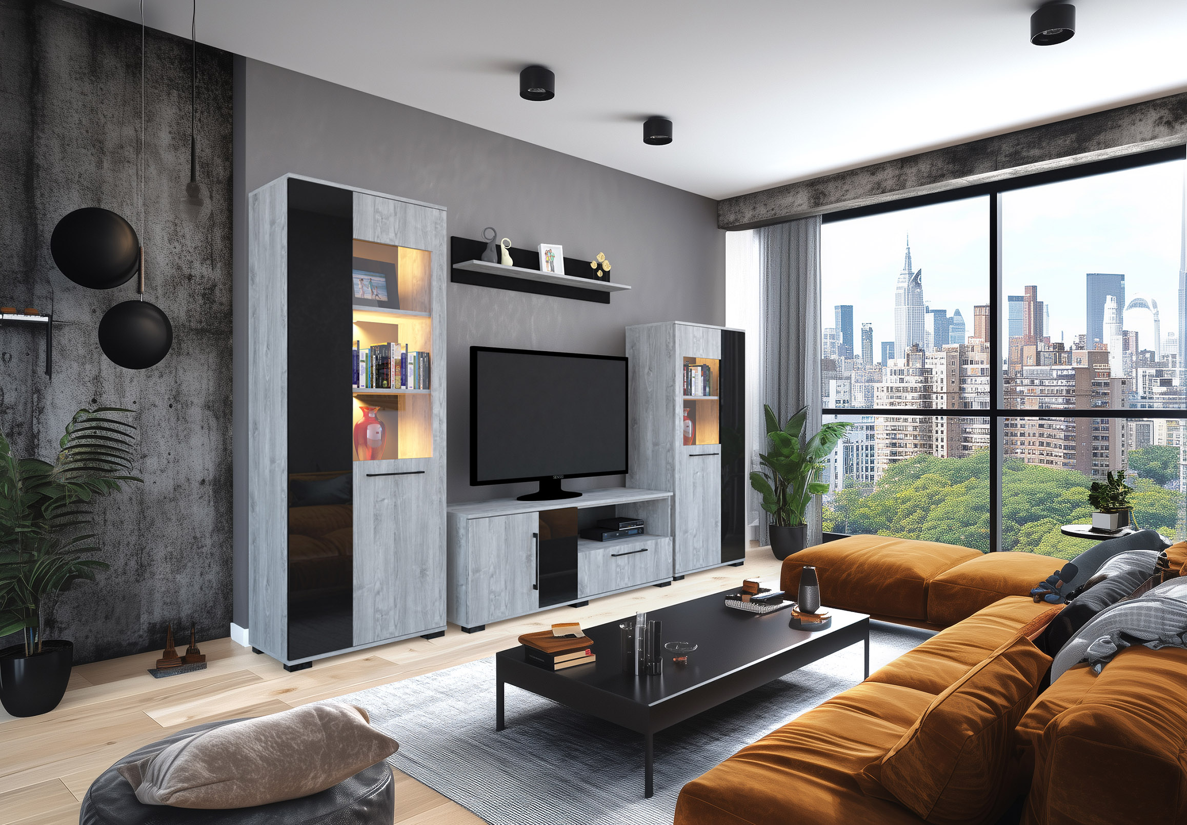 – Merlin elemes szekrénysorunk letisztult, modern megjelenésű, elegáns magasfényű fekete MDF betéttel.