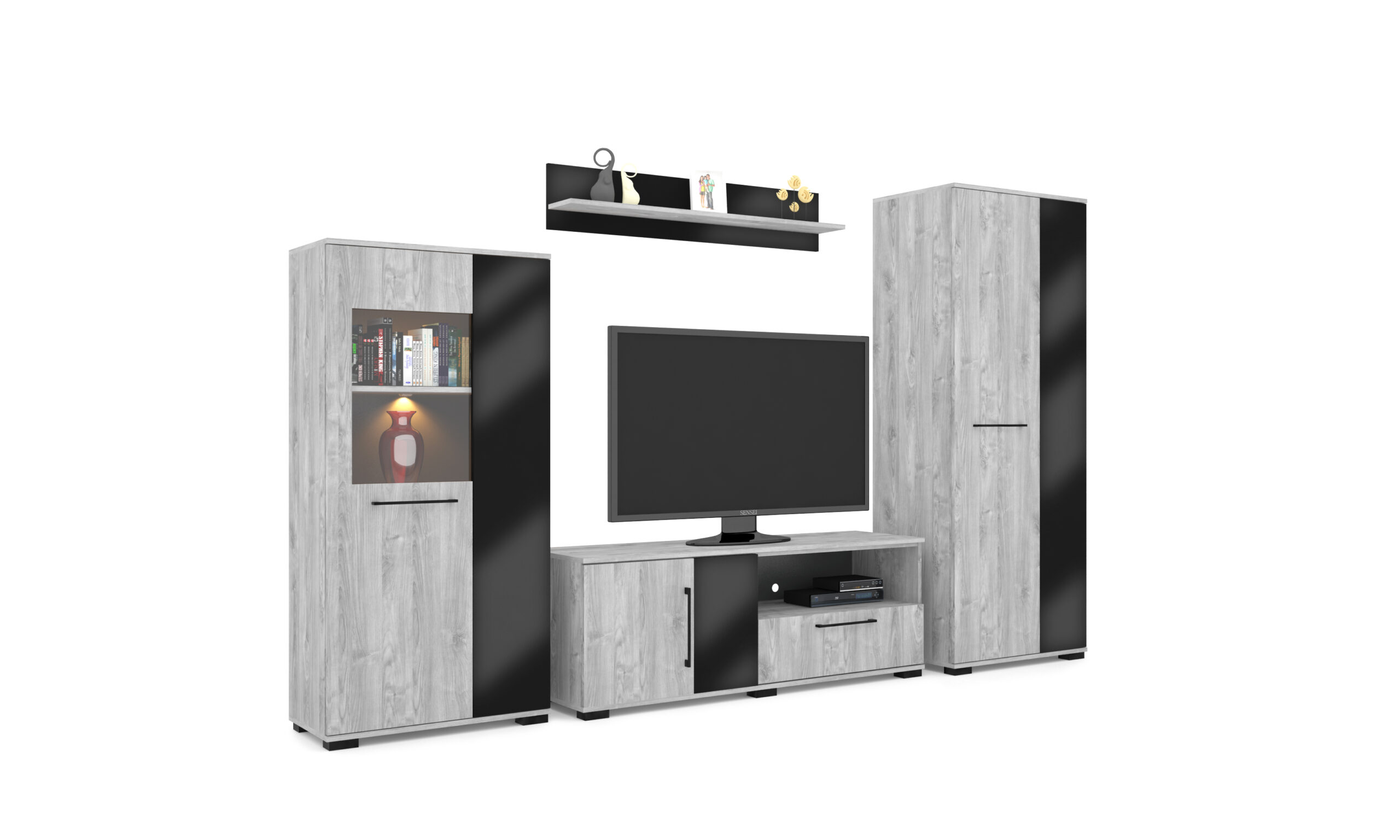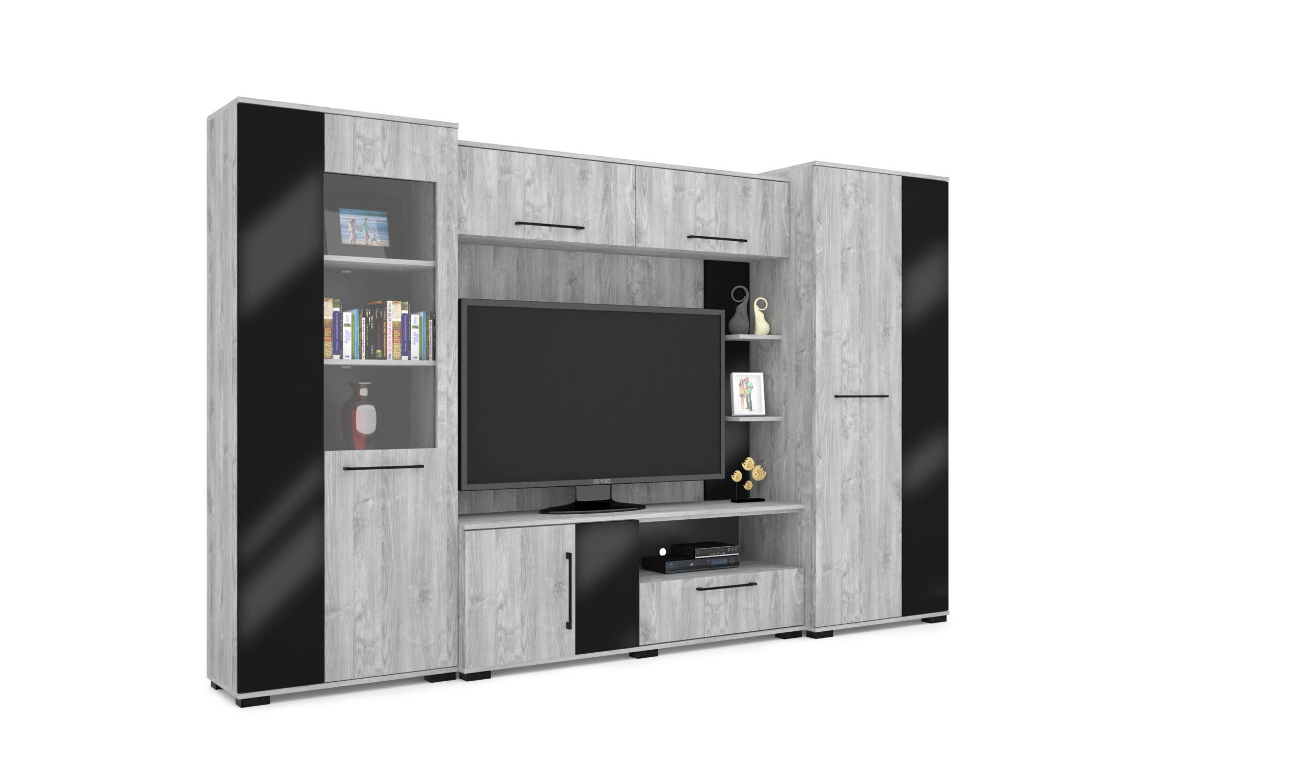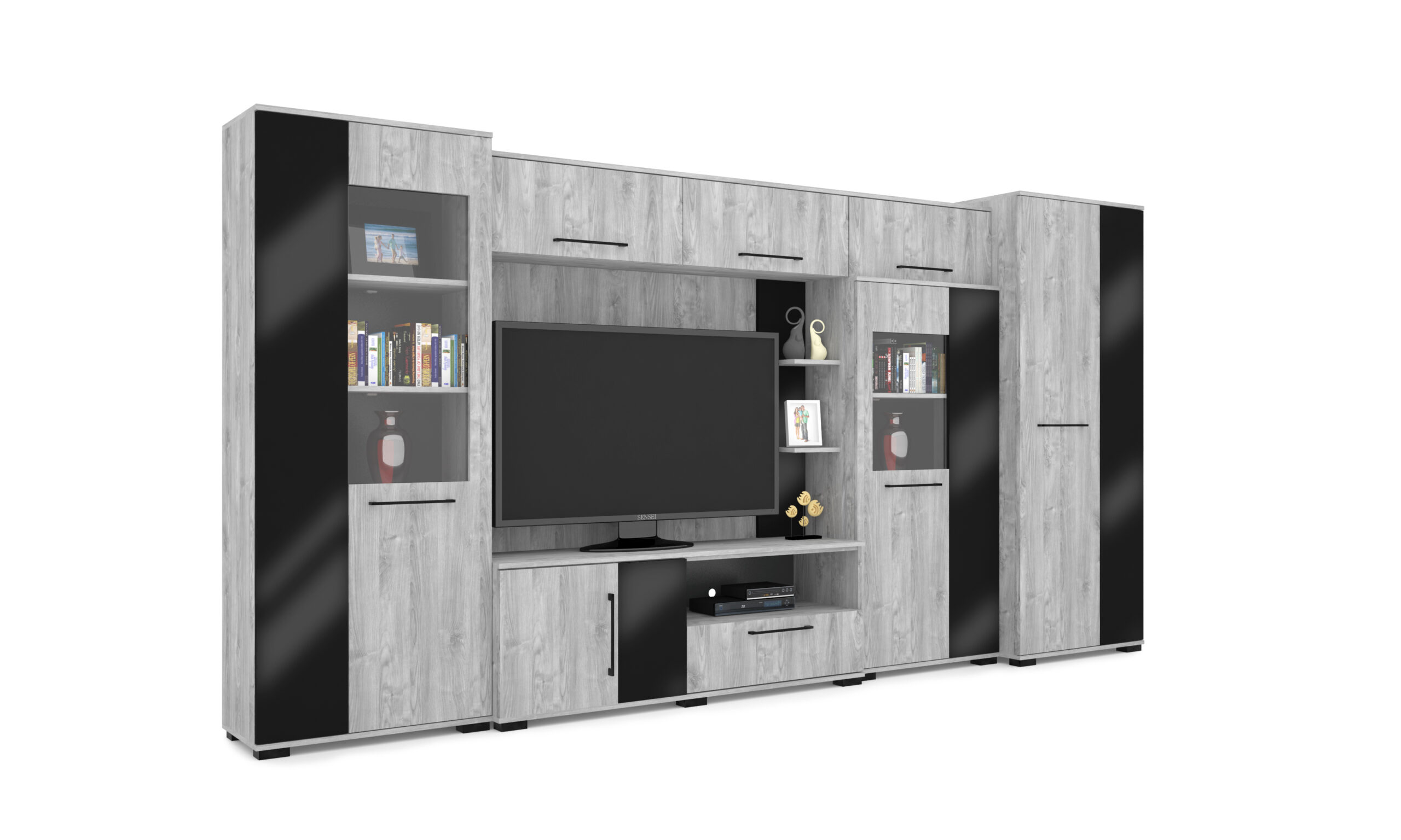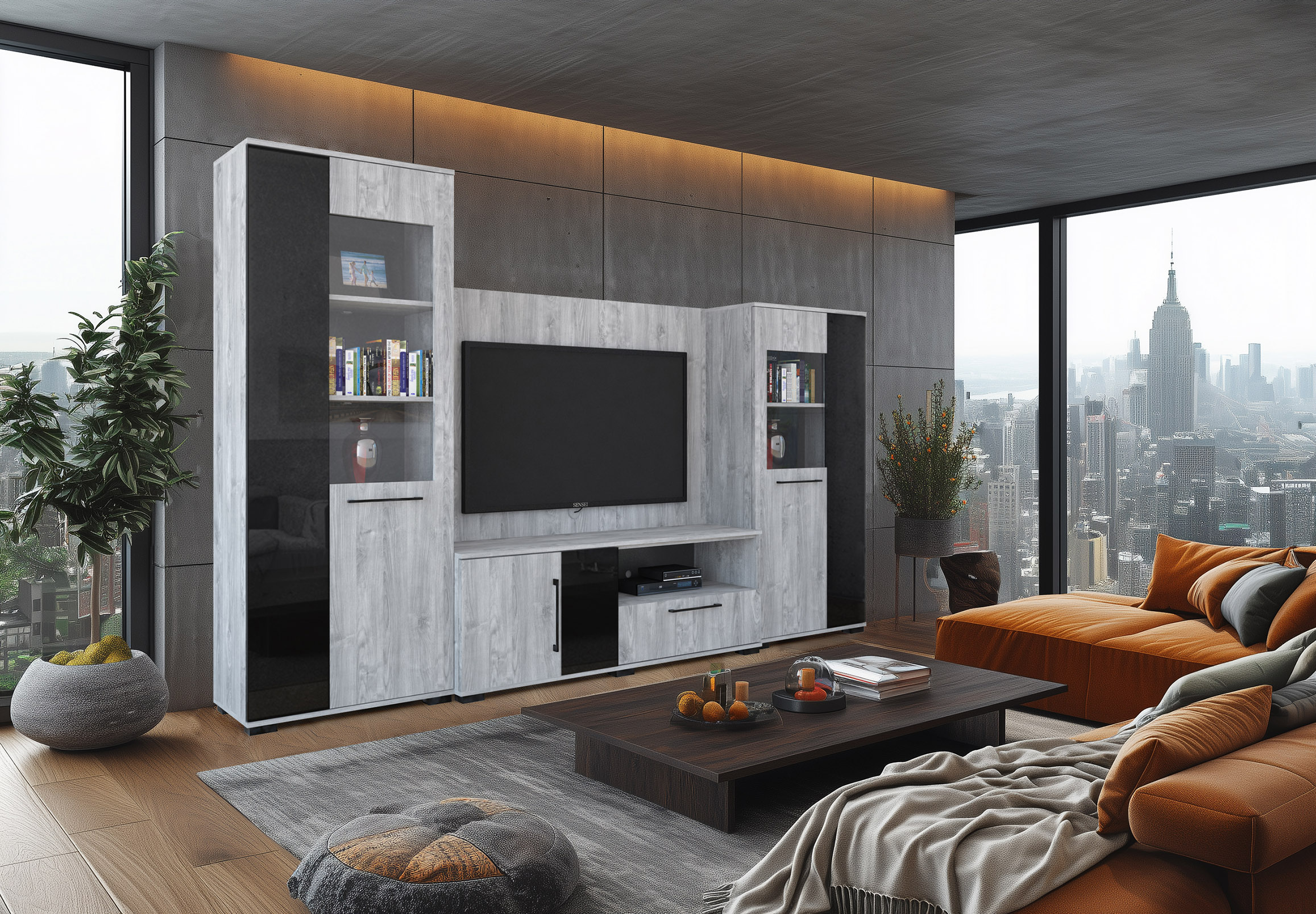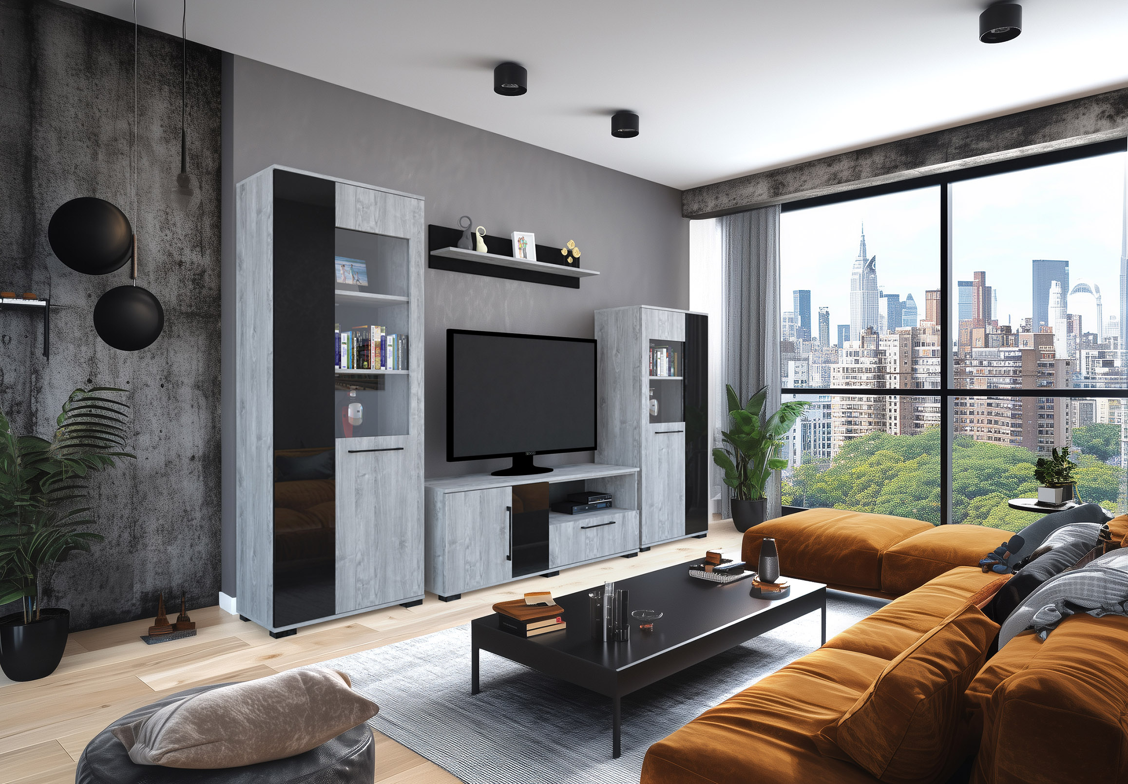 – Merlin elemes szekrénysorunk letisztult, modern megjelenésű, elegáns magasfényű fekete MDF betéttel.