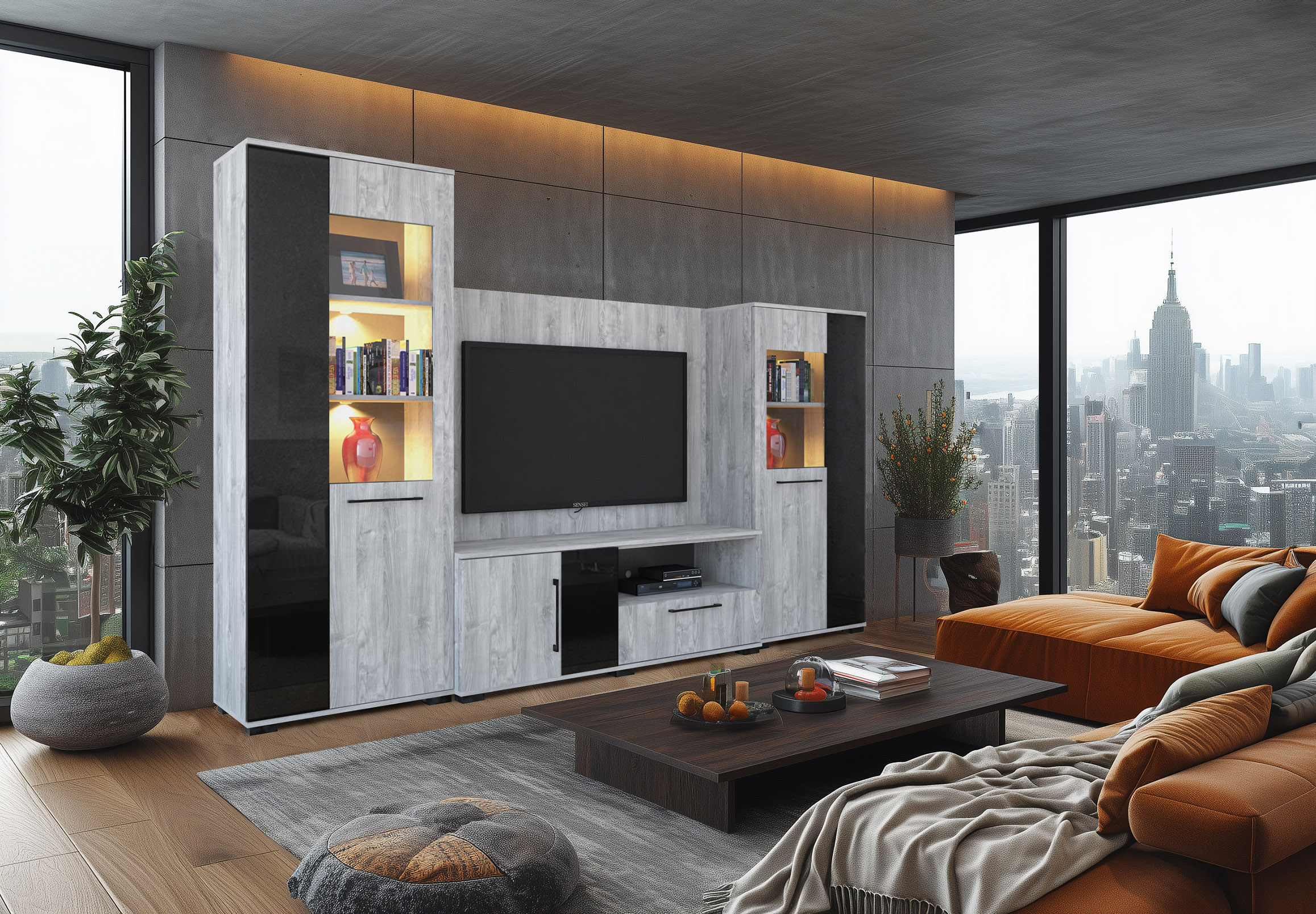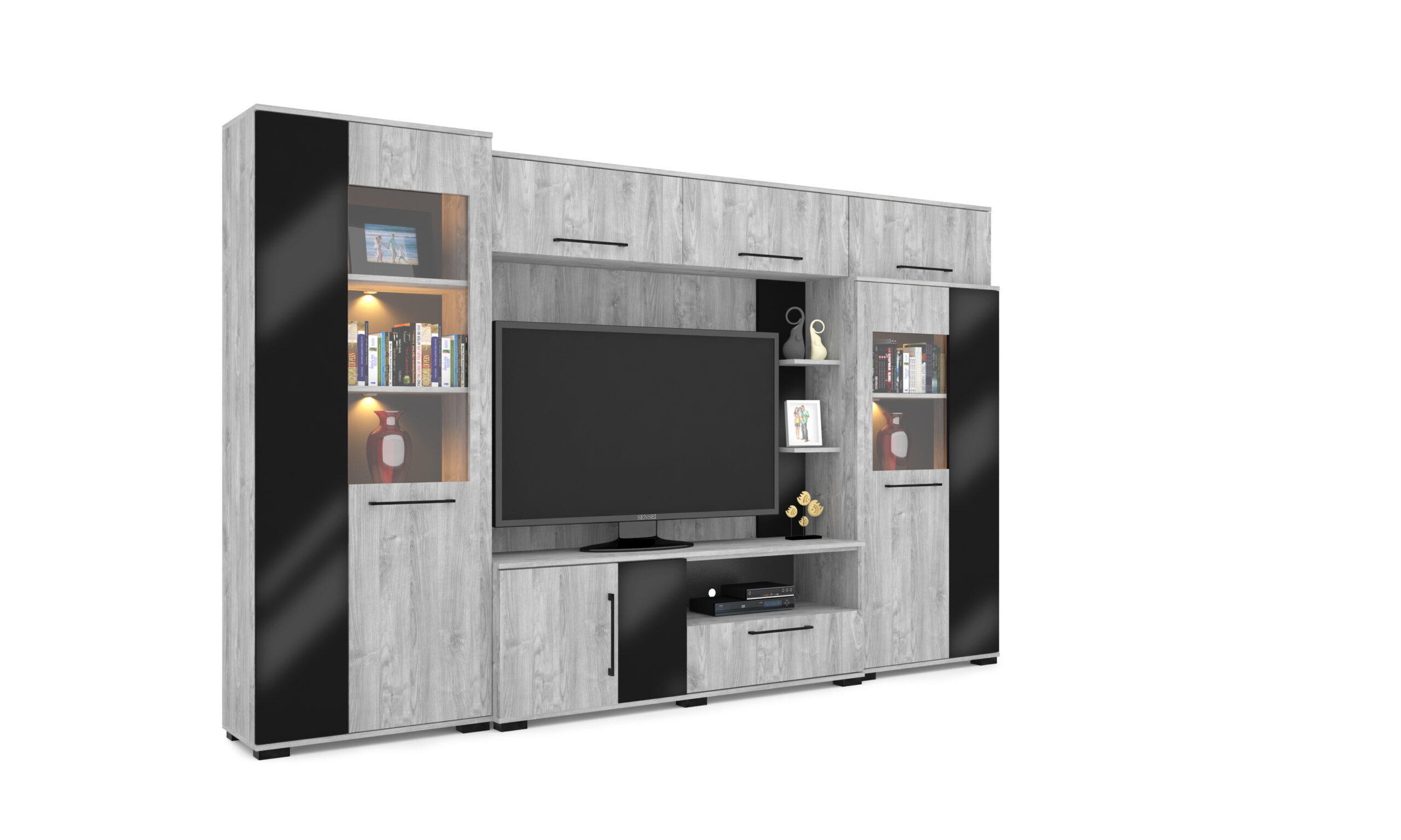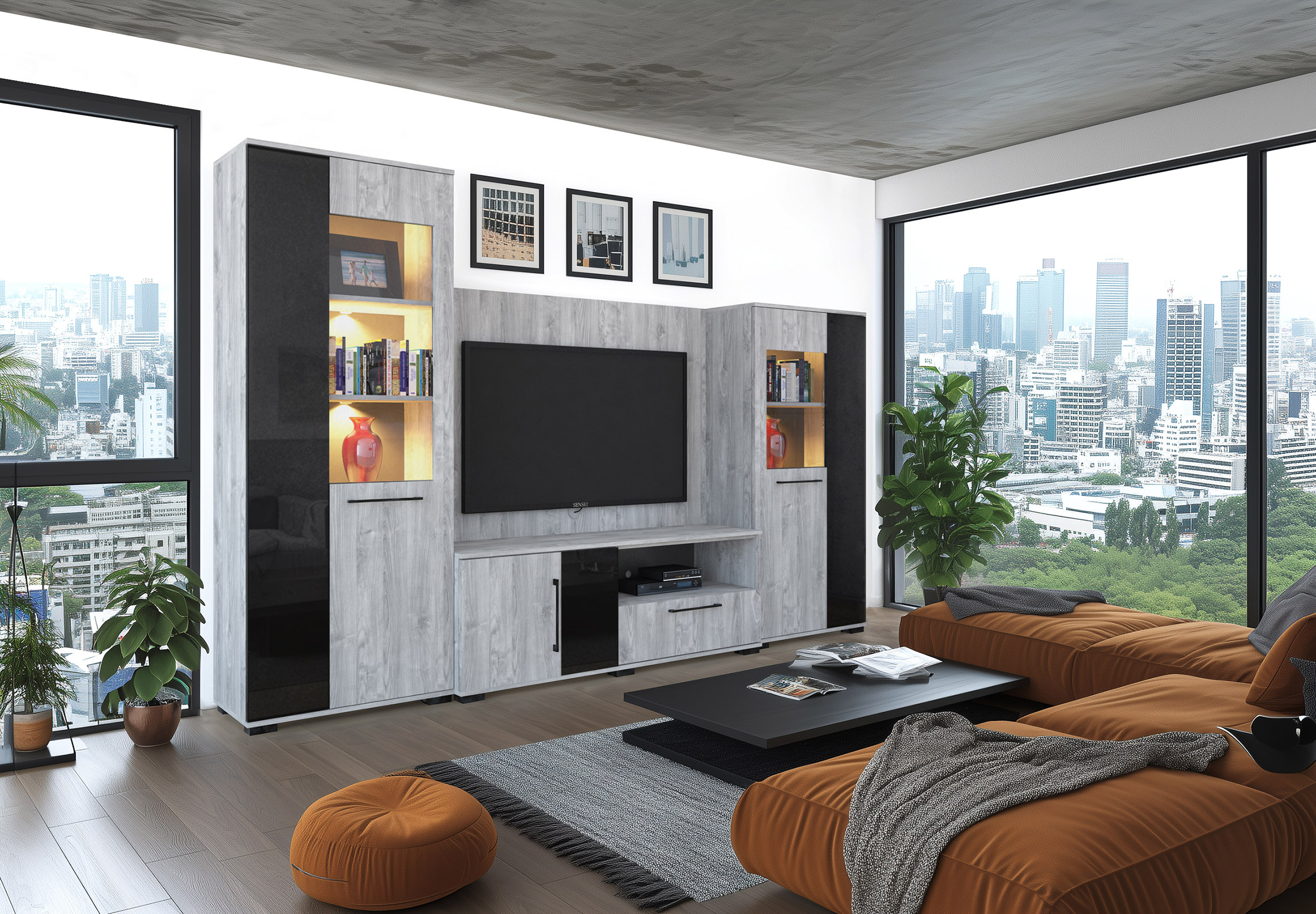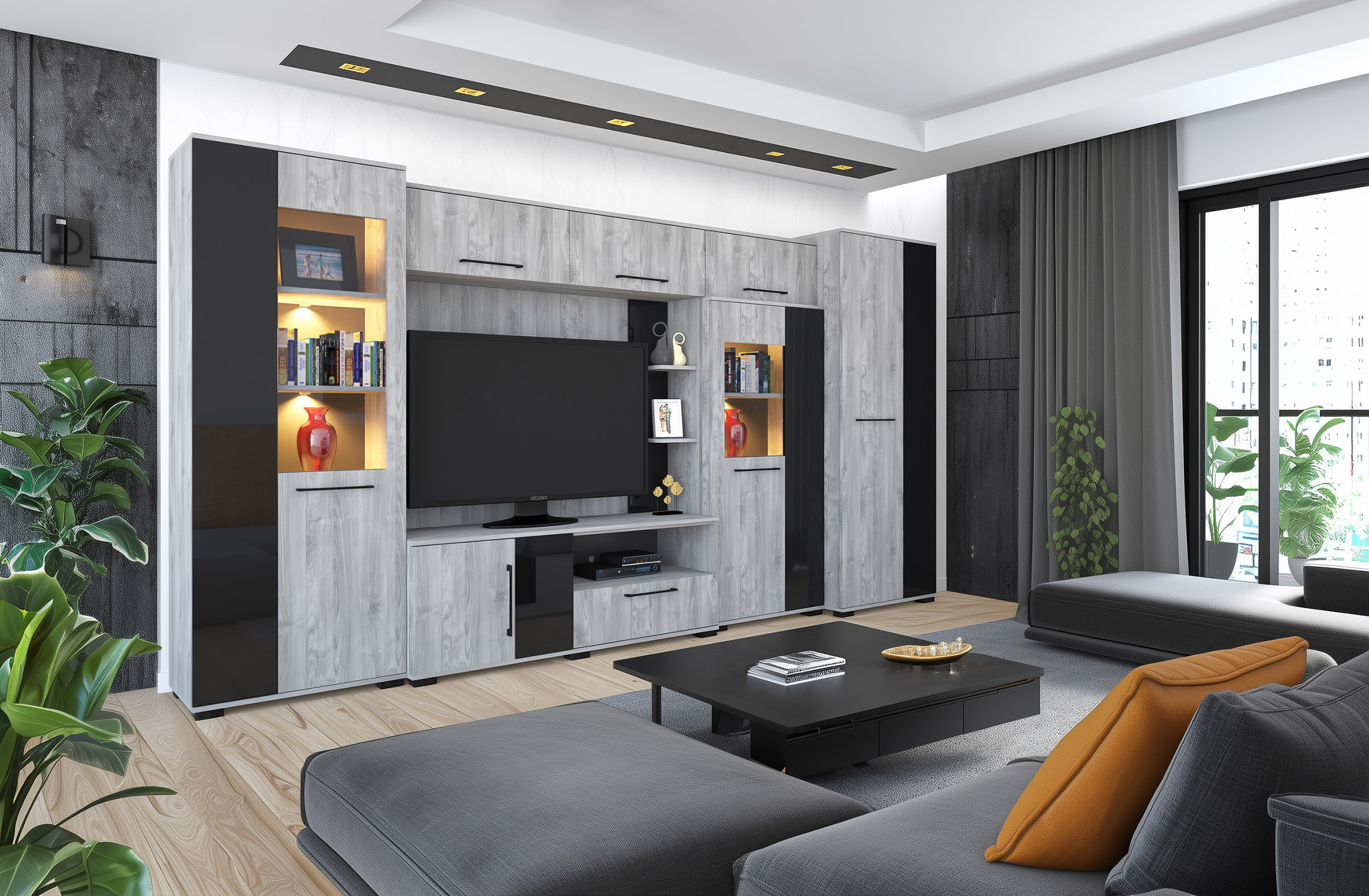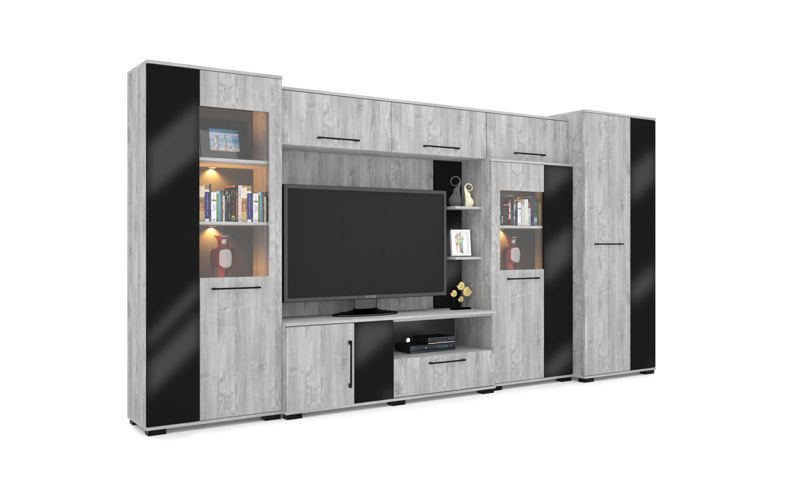 – Merlin elemes szekrénysorunk letisztult, modern megjelenésű, elegáns magasfényű fekete MDF betéttel.