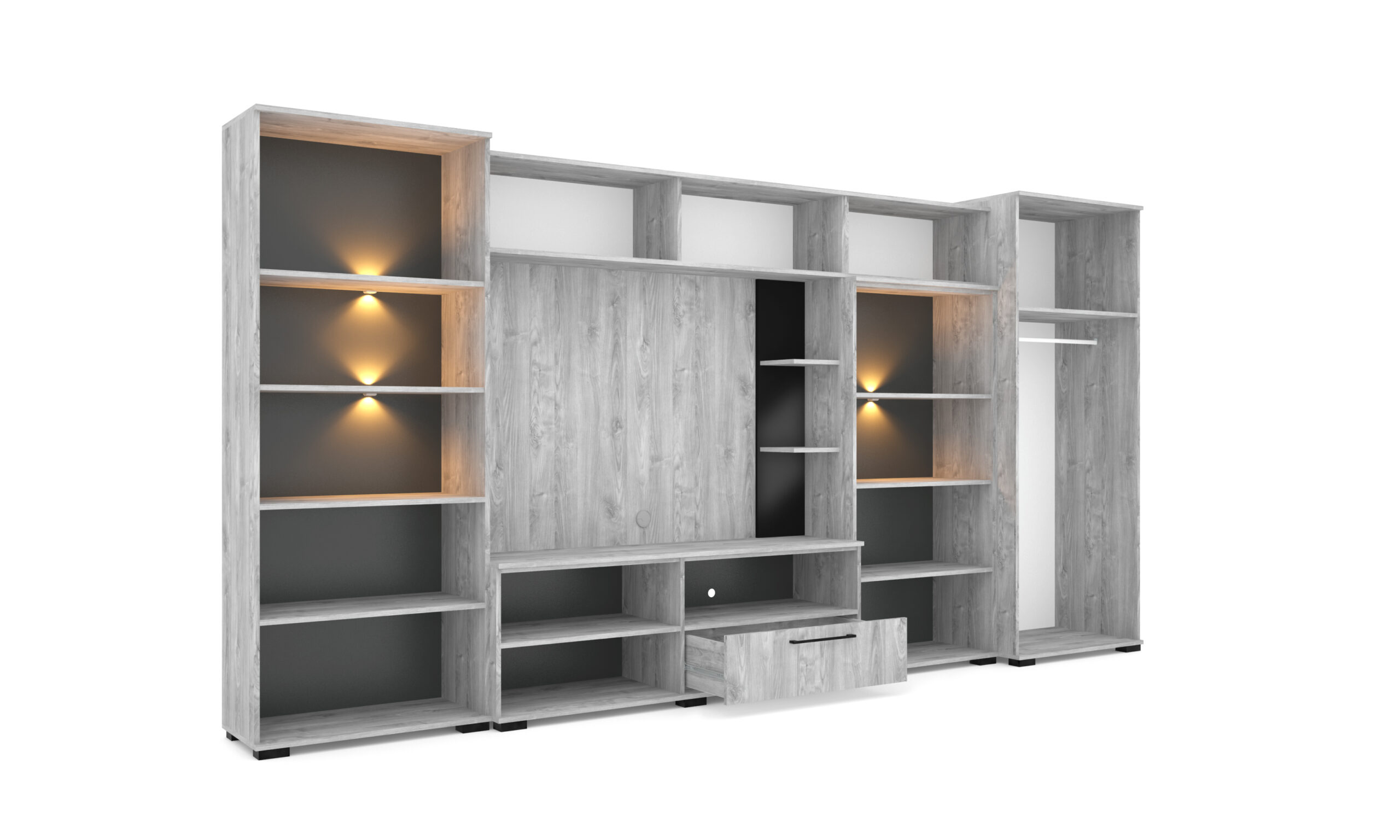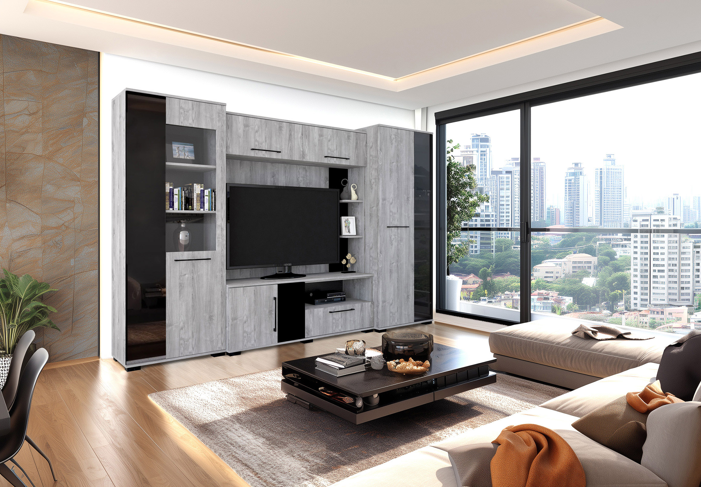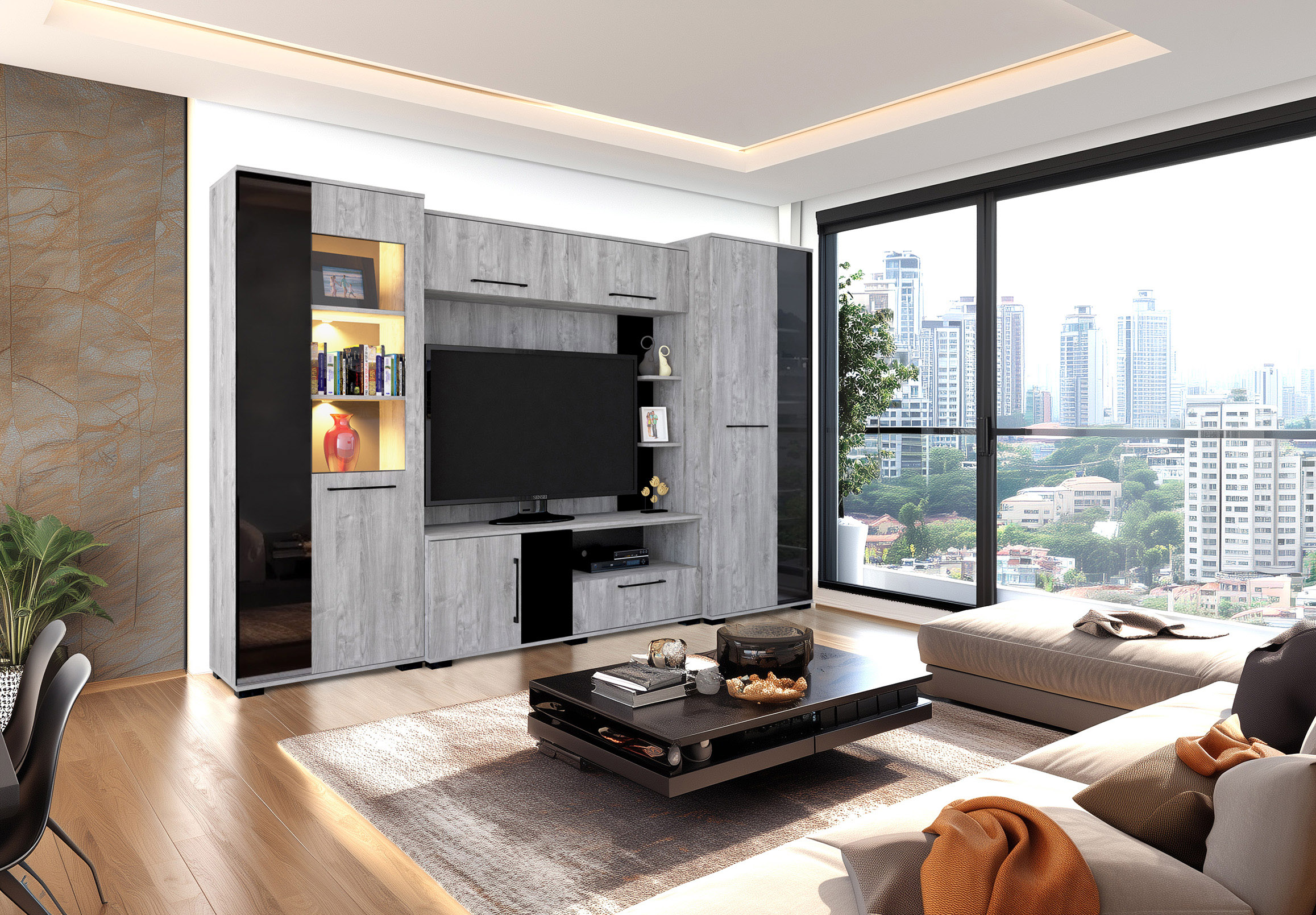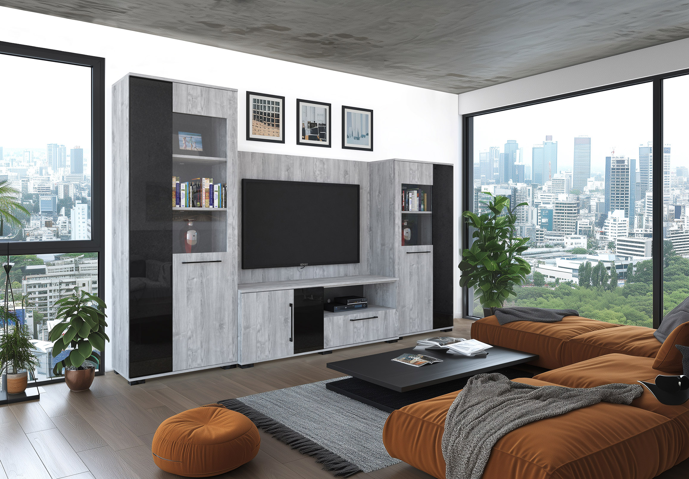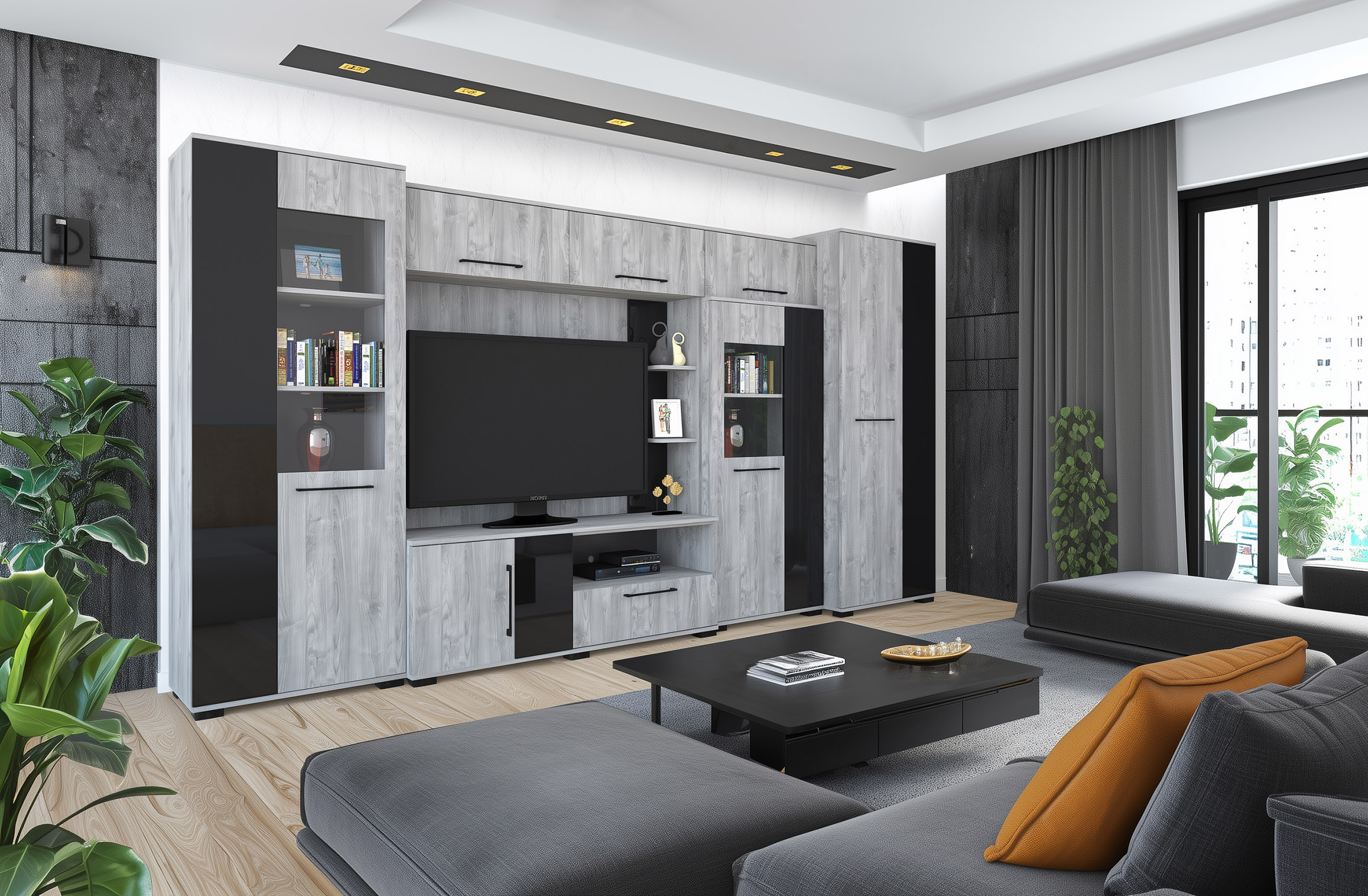 – Merlin elemes szekrénysorunk letisztult, modern megjelenésű, elegáns magasfényű fekete MDF betéttel.