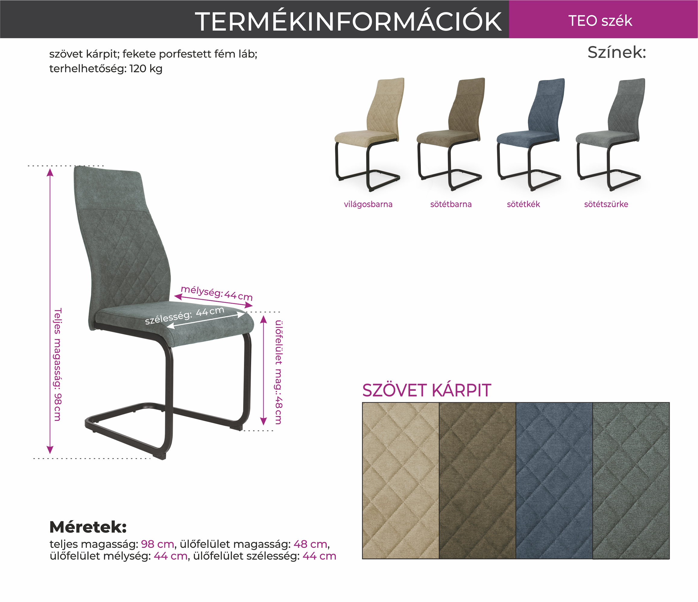 – 4 színben kapható szövet kárpittal, és fekete porfestett fém lábbal kapható a TEO szék.